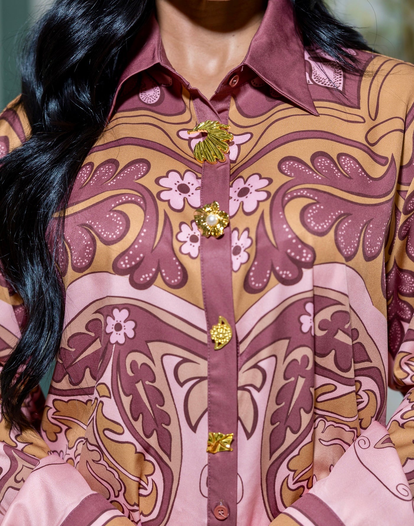 A gorgeous button front blouse with ornate gold statement buttons and a flowing wide leg pant. Designed with a rich vintage inspired print, this set drapes beautifully on the body and transitions effortlessly from polished daytime wear to refined evening.