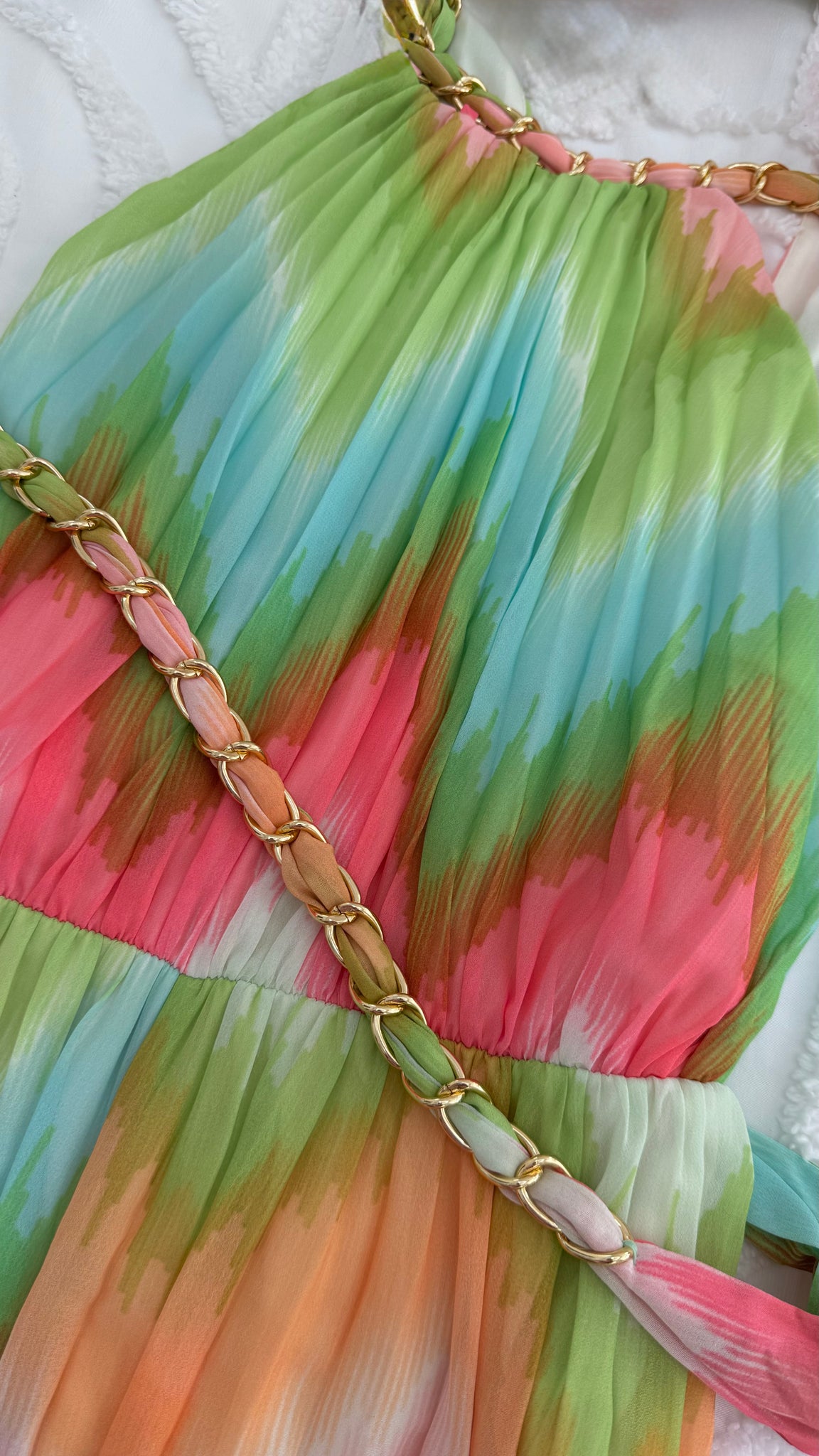 Turn every entrance into a moment. This vibrant chiffon jumpsuit features a halter neckline framed with chain detailing and a matching belt. The beautiful fabric glides as you walk as well as being fully lined for coverage. The bold color and striking silhouette ensures all eyes stay on you.