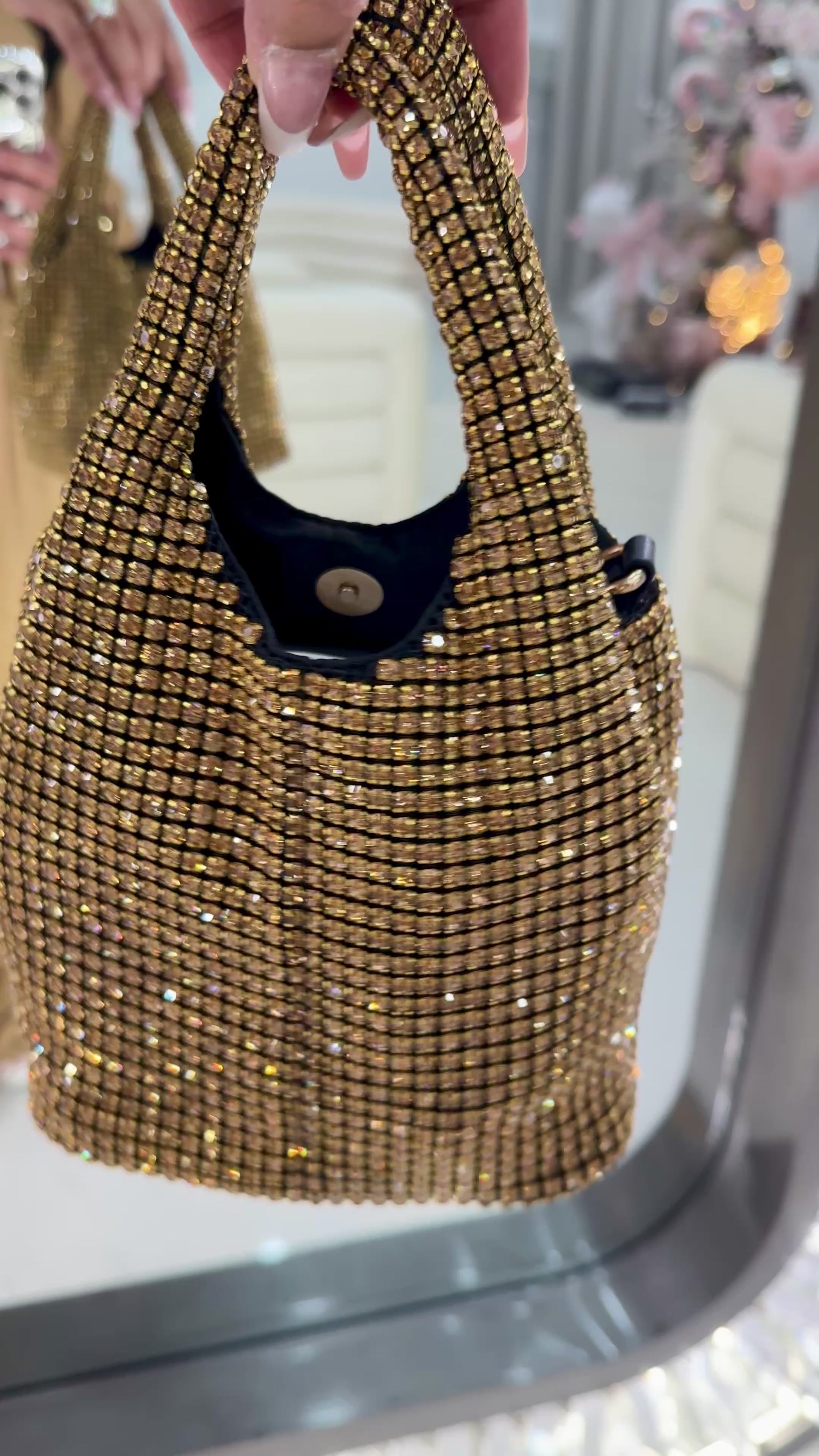 Light up the room in our gorgeous "Fab Life" crystal tote! Adorned with gold crystals this bag may be worn by hand or crossbody. Strap included.