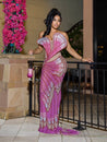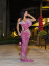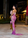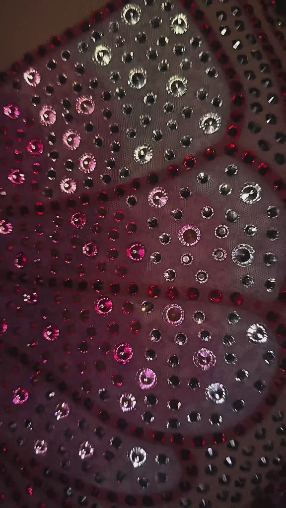 Radiate divine energy in our Papillion Crystal Gown.  A sculptural, hand-embellished masterpiece that captures light from every angle. Designed in a sheer nude base with cascading pink and silver crystals, its butterfly inspired pattern contours the body to perfection. The dramatic sculpted neckline creates an artful silhouette, while the form fitting design elongates the figure before flowing into a soft, glistening train. This dress is stunning.