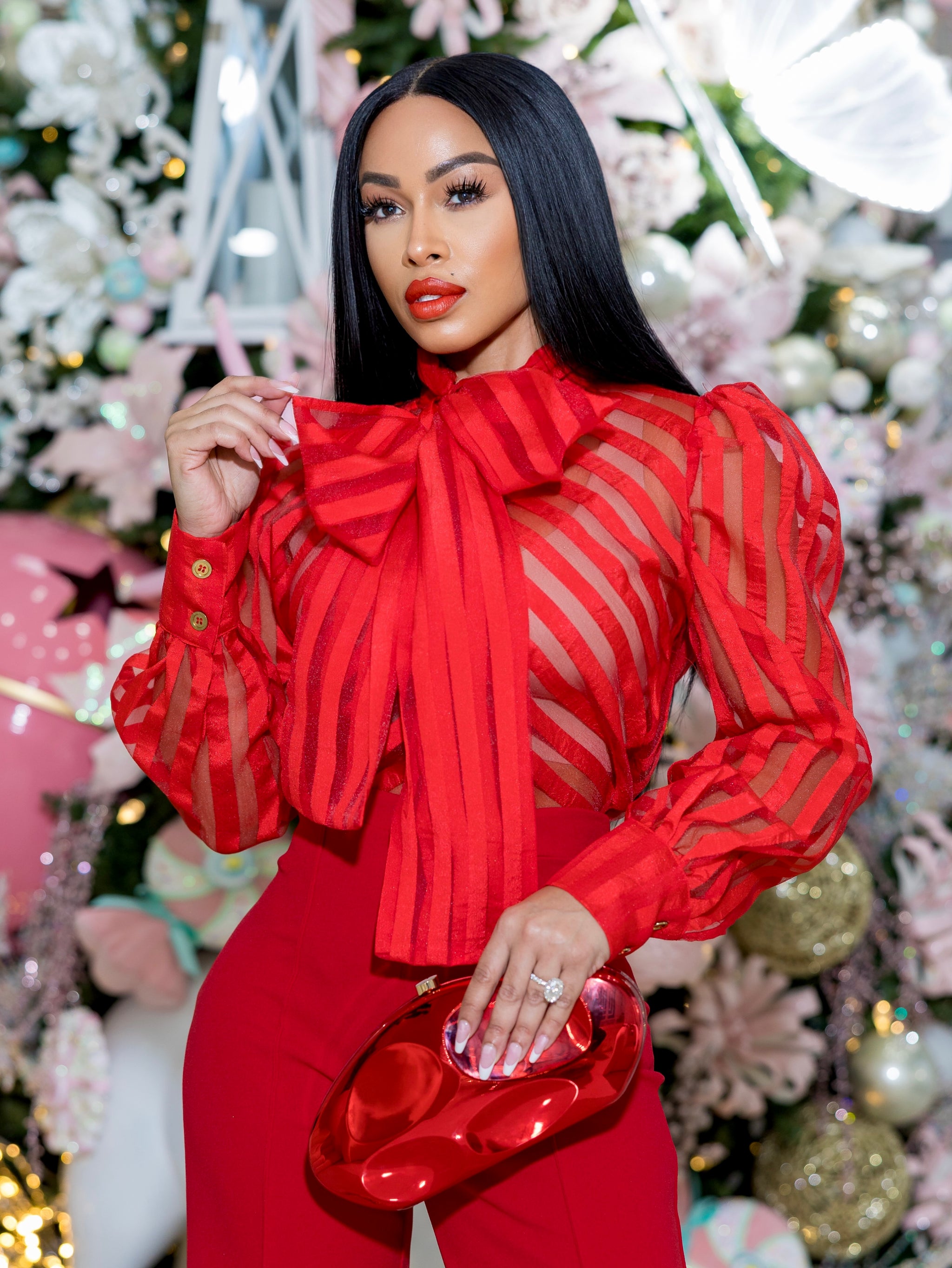 Model wearing size Small. This blouse is sheer. I’m wearing a nude seamless tank underneath.